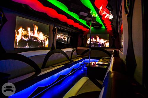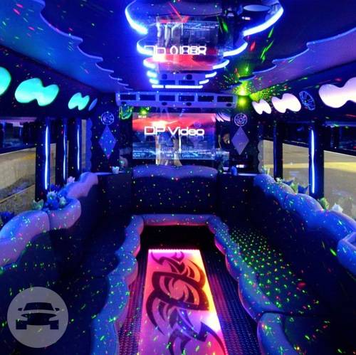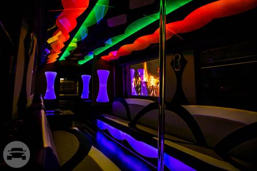 PARTY BUS AMENITIES 27 Guest capacity (1) 50" LED 1080P w basic channels and DVD player Center facing limousine seating Remote controlled Lighting Premium surround sound by JL Audio Laser lighting Auxiliary charging ports and music dock