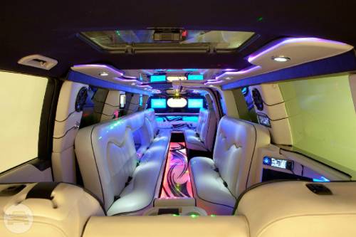 Cadillac Escalade with 5th door, JET DOOR! A sleek black look. Starlight custom disco ceiling. LED Light up disco floors! TV's in the sides (DVD only) Laser lights, strobe lighting. Speakers with Subwoofers and amplifiers Fiber optic light show with starlights throughout the limo Seating for up to 20 including a rear VIP section. 3 bar areas with cooler for ice, champagne chiller and decanter Exterior underglow lighting, strobe lights.