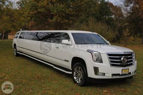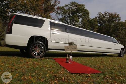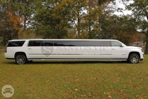 18 Passenger Capacity Custom Ultra White Exterior Sleek Single Window Design 3000W Pioneer® CD/DVD Surround Sound System Aux Connection for iPhone & Android Custom Leather Interior w/rear VIP Area 4 LCD TV’s and 1 Large LCD TV in the Divider Interactive Disco Ceiling w/ LED Lighting Flat Screen Touch Controls Custom Wood Floor and Under Seat LED Lights Dual Custom 3 Level Bars with LED & Fiber Optic Lighting Multi-point Laser Machine Interior and Exterior Strobe Lights Extra Large Beverage Bins & Ice Chests Under Carriage LED Lighting 2015 18 Passenger Cadillac Escalade ESV Mega Stretch Limousine We are proud to introduce our newest additions to our growing fleet of Fine Vintage Rolls Royce’s and Bentley’s, Stretch Limousines, Chrysler 300 stretch Limousines, SUV limos and Limo Coach Party Buses in NJ. The 2015 Cadillac Escalade ESV Mega Stretch Limo. As with all of our Luxury Exotic Limos we have sparred no expense in making this custom stretch limo unique. While most of our competitors have the regular sized Escalade, we want our clients to have the extra room they deserve so all of our Escalades are ESV models, which means they are 2 feet longer then the regular Escalades. When it comes to comfort…size does matter! The exterior of the Cadillac Escalade ESV is finished in an Ultra White glossy finish with a modern sleek single window design. Inside we have continued with our ever popular NYC lounge styled custom interior fitted with two tone leather seating, Crocodile leather accent., Custom Wood Floor, Dual 3 Tiered bars with color changing LED’s and fiber optic mood lighting, interactive disco ceiling, LED Lighting under the seats, 4 LCD TV’s, Large LCD TV in the privacy divider, incredible high powered Pioneer® CD/DVD player with auxillary media connections and Dual Sub Woofers to get everyone rockin’! Whether you’re looking to party with the boys or girls one last time at your NJ bachelor or bachelorette party, arrive in style at your NJ or NY Prom, or want to make a grand entrance at your NJ Wedding, make sure its in a limousine by the NJ limo professionals at Santos VIP Limousine.