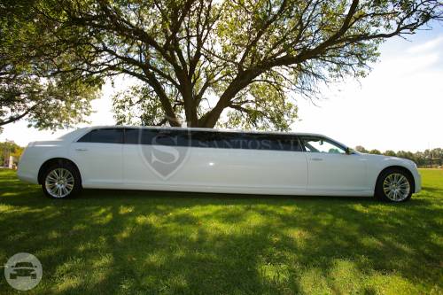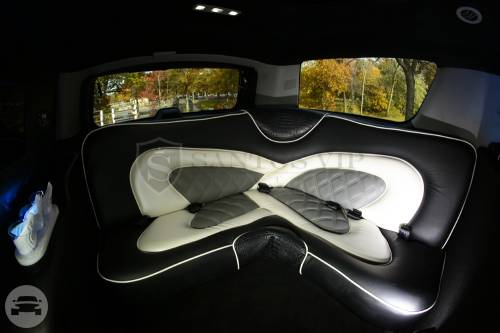 10 passenger capacity Sleek single window design Interior laser light show Sony™ Xplod sound system AM/FM/MP3/CD Player DVD Player with 3 LCD TV’s Complimentary soft drinks Glossy white exterior Crystal stemware & rock glasses Color changing exterior LED lighting Multi-color fiber lighting Interior and exterior strobe lighting Stainless Steel bar w/ built in coolers Custom two-tone leather seating Disco LED lighted ceiling Personable chauffeurs Santos VIP Limousine has always been on the cutting edge of the industry by offering some of the most sought after luxury limousines available. Our new sleek and sexy Chrysler 300 Super Stretch limo is no exception. This gorgeous stretch limo can seat up to 10 guests, has a “Glossy White” exterior, custom two-tone interior, custom bar with stainless steel accents, LED disco lighting in the ceiling, multi-color fiber lights, a state of the art sound and video system with multiple flat screens and DVD player. Only Santos VIP can bring you a limousine of this caliber, call us today and arrive at your next event in style! The Chrysler 300 Stretch Limousine is perfect for Weddings, Proms, Nights on the Town or any other special event in NJ, South Jersey, NY, Philadelphia or Eastern Pennsylvania.