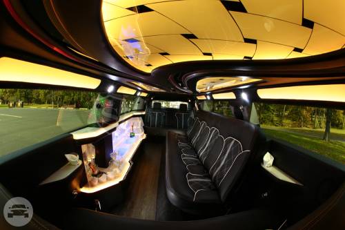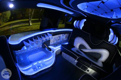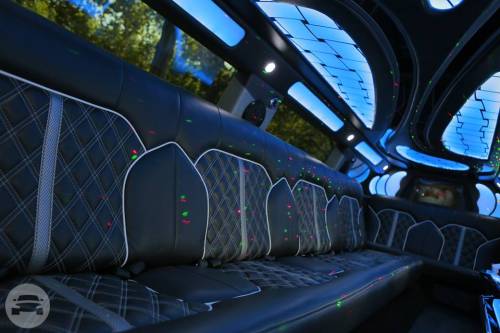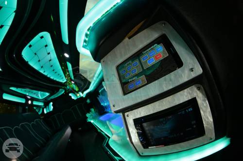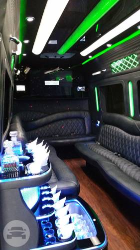 15 passenger Black exterior Charcoal leather interior Limousine style interior Interior standing height over 6 ft CD/DVD/FM USB/AUX Input Surround Sound System Two 40" flat screen TVs Fiber optic & neon lighting