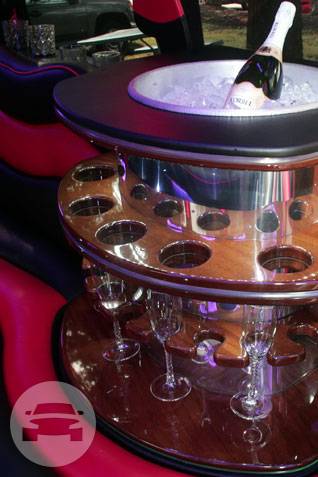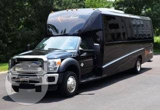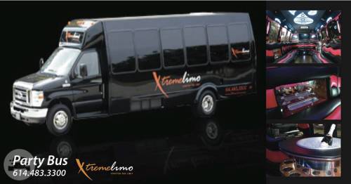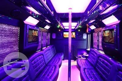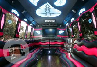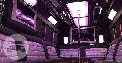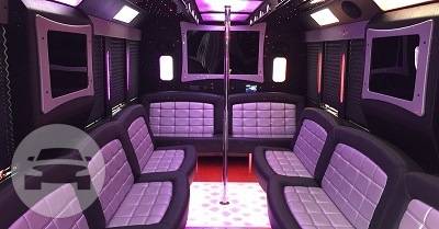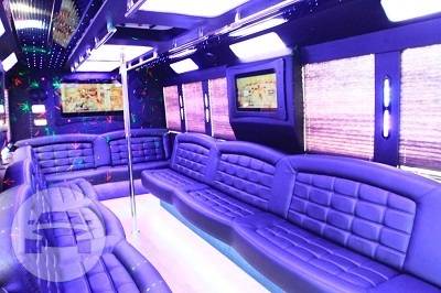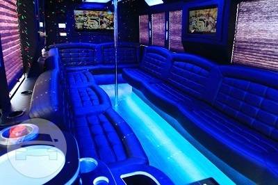 Comfortably Seats up to 27 People Black Interior Black Exterior Wood Grain Flooring Four Huge flat screen LED TVs (42" and 32") Alpine Stereo with 8 speaker surround sound and iPod dock DVD Player Ice Cooler Dance Pole