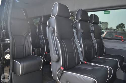 14 Passenger Executive Leather Seating with three point seat belts, custom flooring with power points on each row of seats. Upgraded stereo with PA system for tour guides use. Luggage compartment. Power step for ease of entry .