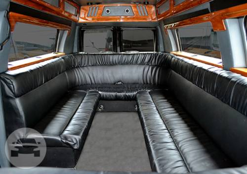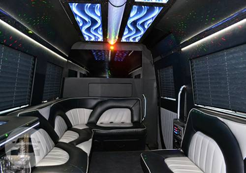 Our new Sprinter limousine seats 12 (in some cases 13) average-sized people comfortably. This vehicle's many amenities include LED lighting, champagne buckets, glassware, flat-panel televisions and an upgraded stereo system. For some groups with slender or petite individuals, 13 passengers can be accommodated comfortably.