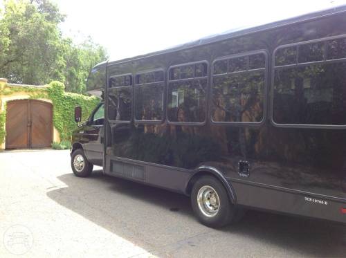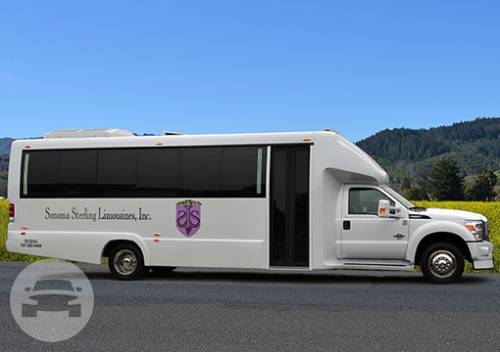 Our newer large shuttle bus has been recently upgraded to an executive bus. Its forward-facing, reclining, high-back black leather seats have seatbelts. Included amenities are a P.A. system, flat panel display, CD/DVD player, and MP3 player hook-up. We have an optional luggage storage wall for wine tours or airport transfers, which reduces the passenger count to 22. This bus has a five hour minimum on Fridays and Sunday and a six hour minimum on Saturdays. Complimentary chilled bottled water provided for all passengers during service. Passengers may consume their own food and beverage on board.